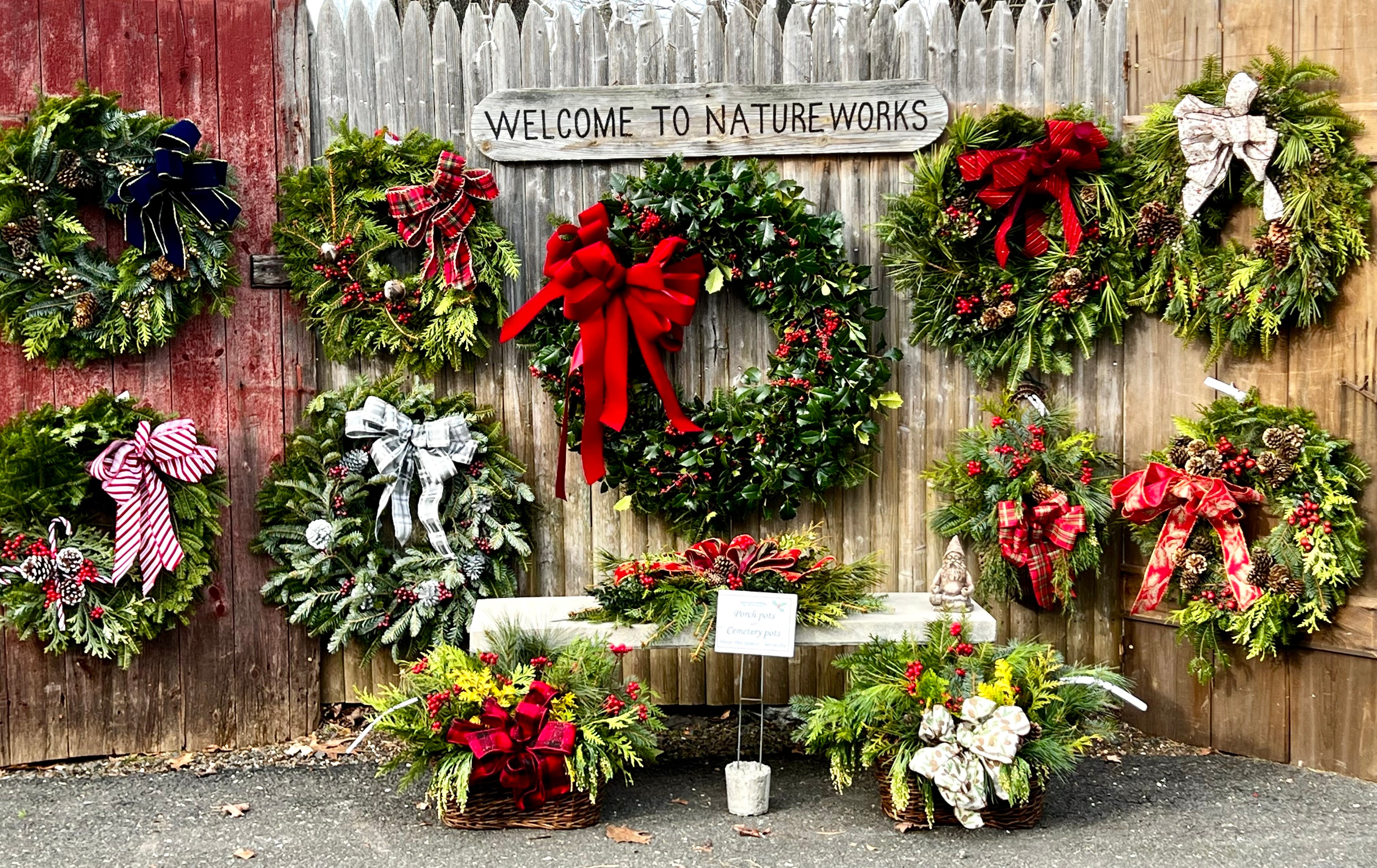 At Natureworks, we do the holidays differently. Come and stroll our handmade wreaths, swags, porch pots and winter arrangements in a relaxed atmosphere. Smell the holidays with our fresh unusual greens, cut, bundled and ready for you to make your own creations. To preserve freshness, we take an extra step and dip the greens in Wilt-pruf, an all natural pine sap.